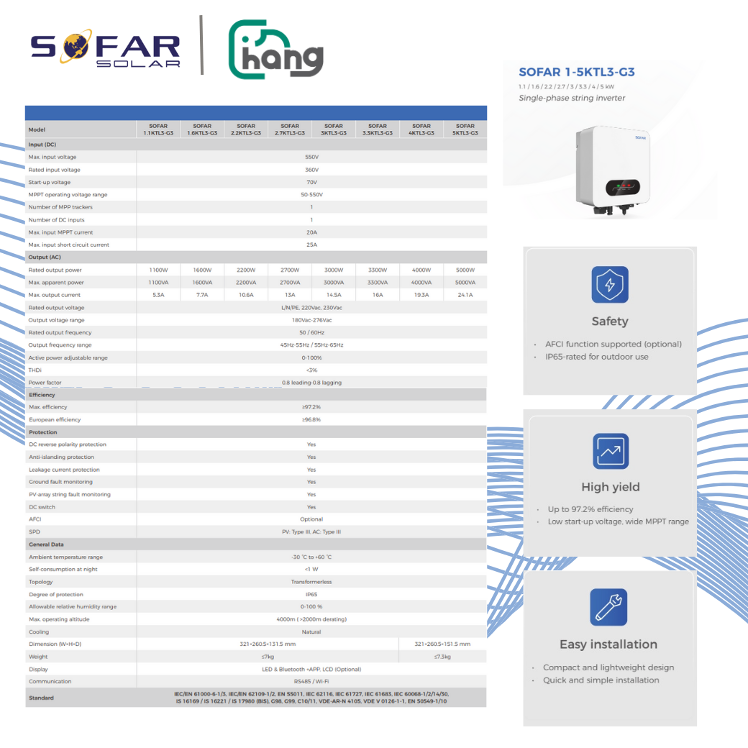 อินเวอร์เตอร์ SOFAR 1600TL-G3 เป็นอินเวอร์เตอร์แบบ On-Grid สำหรับใช้งานร่วมกับแผงโซล่าเซลล์บ้านพักอาศัยขนาดเล็ก–กลาง (1.6 kW) โดดเด่นเรื่องความเสถียร ประสิทธิภาพสูง และระบบความปลอดภัยครบถ้วน เหมาะสำหรับผู้ที่ต้องการผลิตไฟฟ้าใช้เองเพื่อลดค่าไฟในบ้านโดยไม่ต้องใช้แบตเตอรี่ รองรับแอปพลิเคชัน SOFAR View / SolarMan สำหรับตรวจสอบการผลิตไฟฟ้าแบบเรียลไทม์